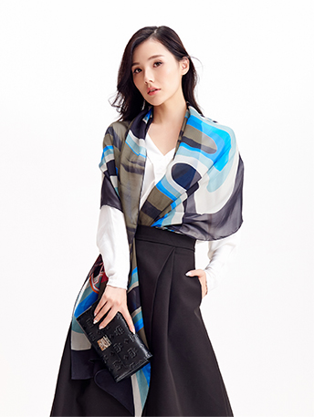 將花窗明月的意境映然與水波游動當中,展現蘇式庭院的意象之美。水墨質感中點綴藍色的水波與花窗明月,悠然愜意,將一幅蘇式美景印于絲巾之上。